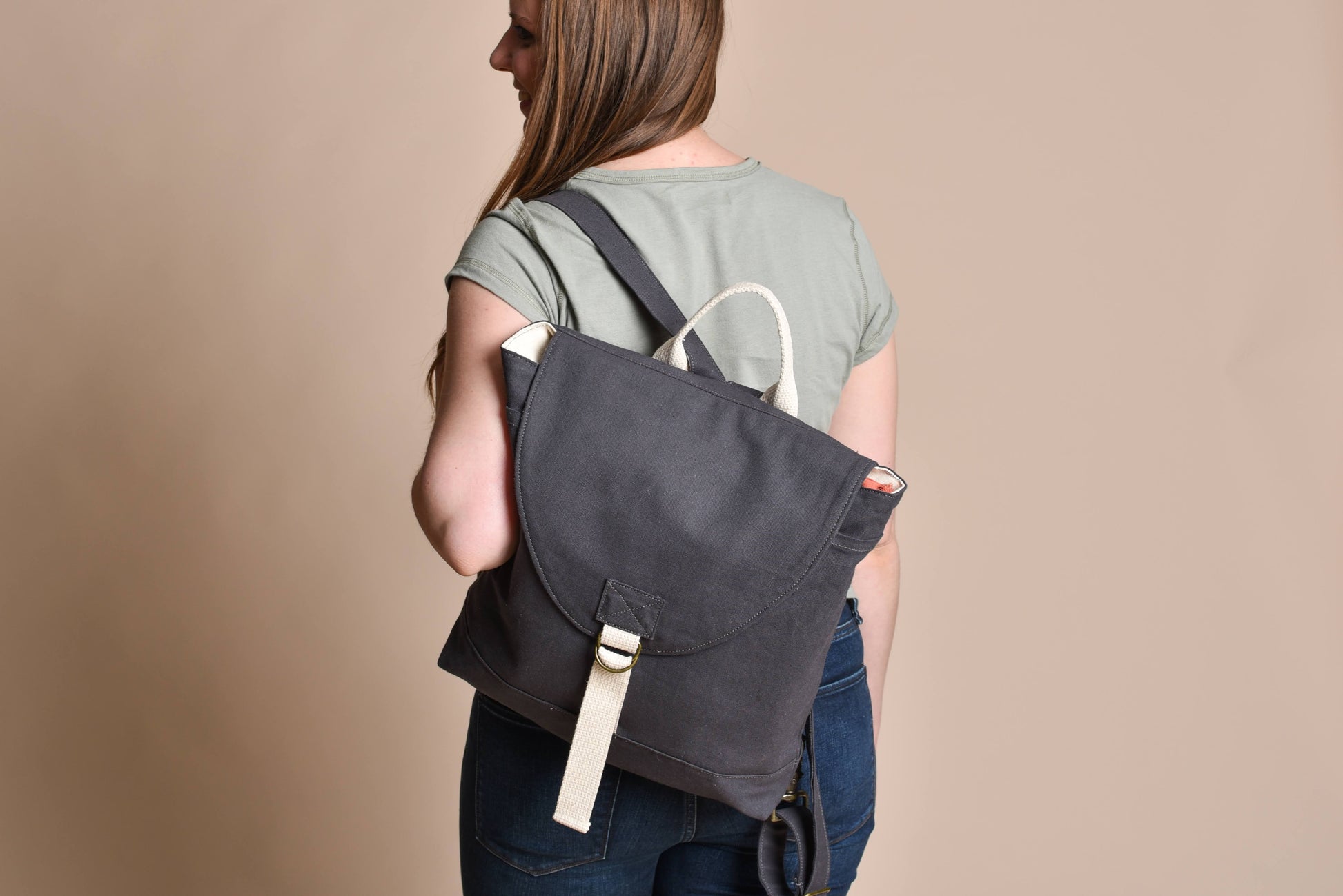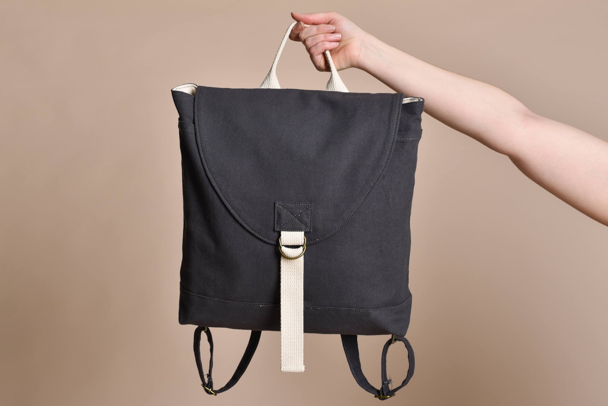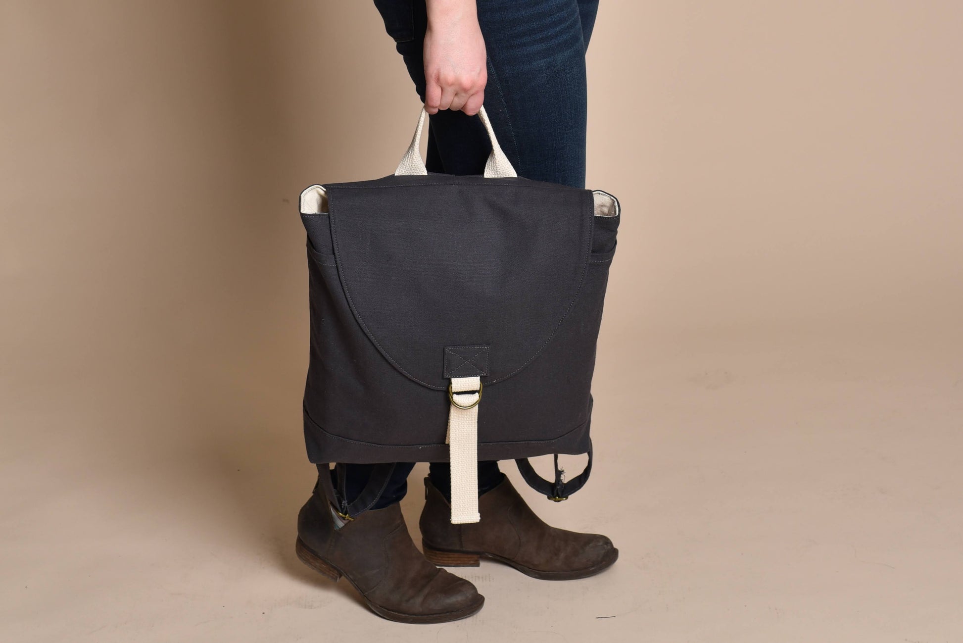 Inspired by the adventures within, this backpack is handmade from cotton canvas and metal hardware sourced within the USA. It's fully lined with natural colored canvas. The exterior boasts two spacious pockets. The interior features one zipper pocket and 2 roomy slip pockets. The top closes with a flap and D ring buckle.