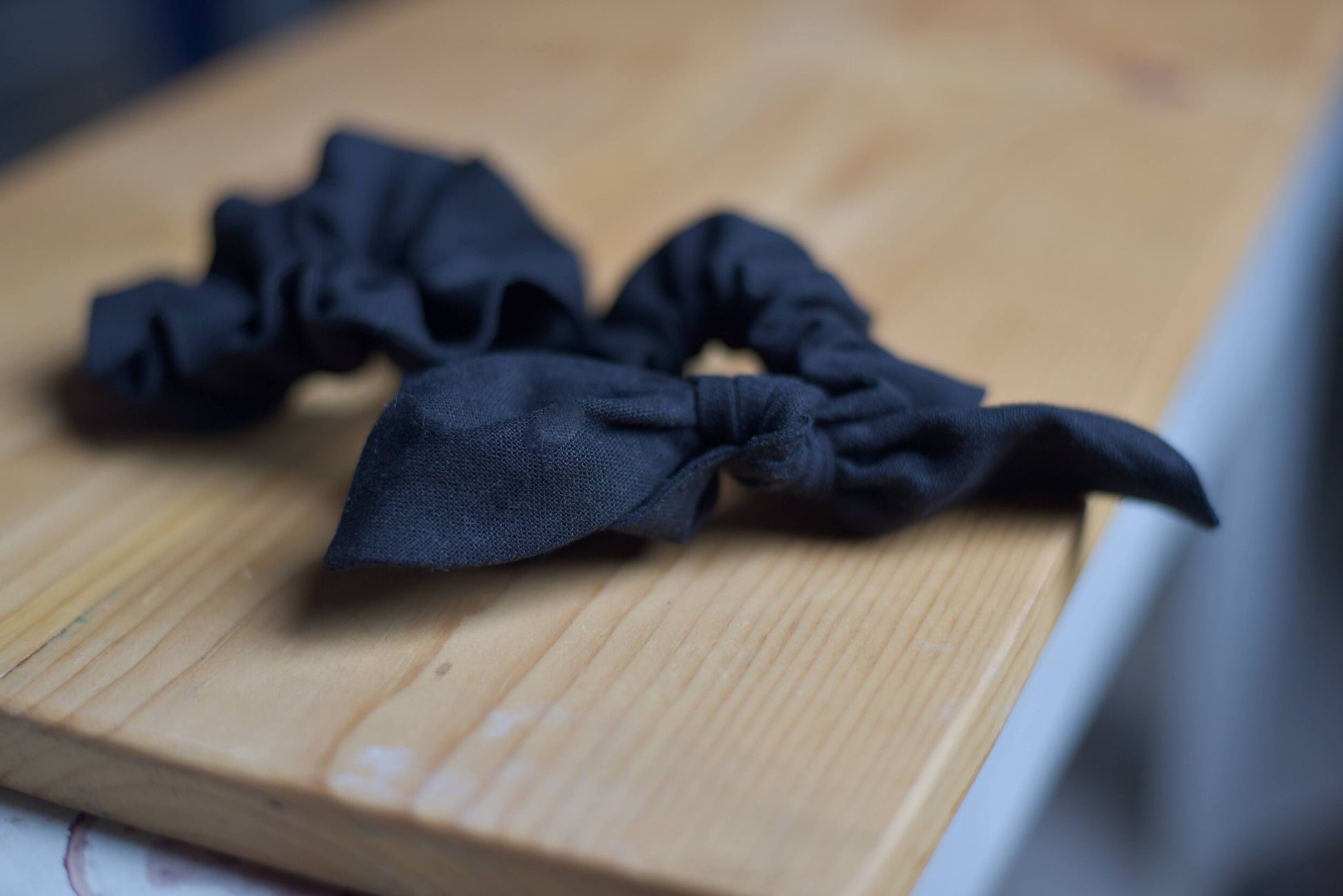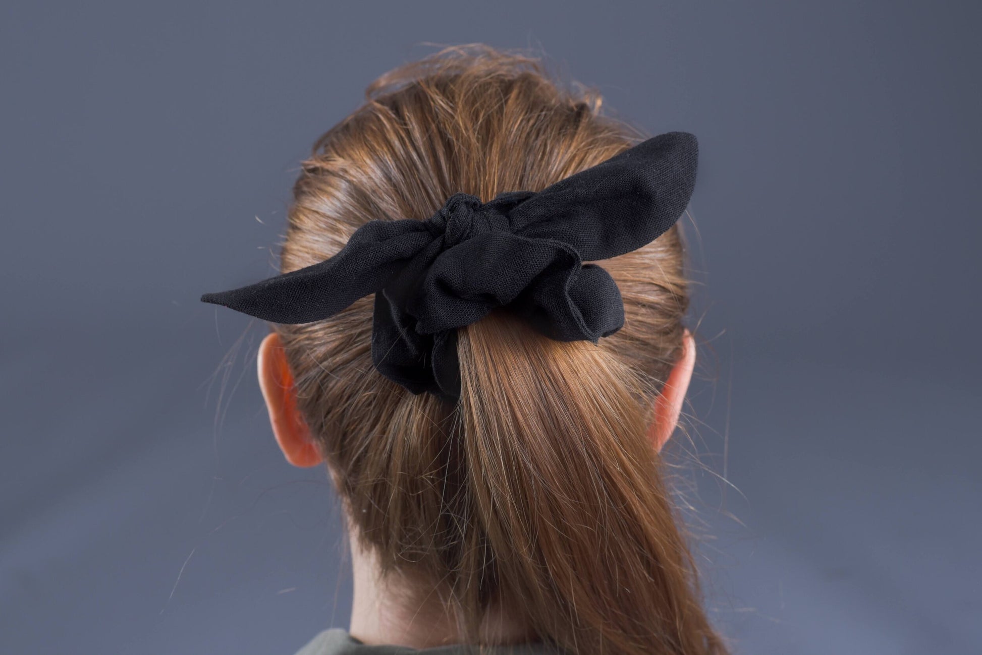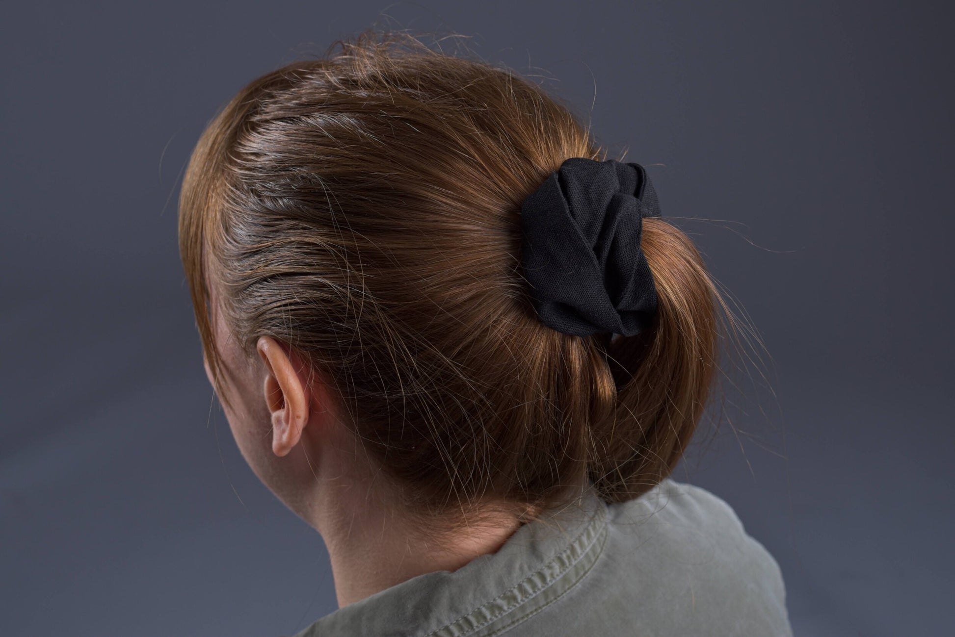 Beautiful full fabric scrunchie fits perfectly around wrist and wraps 2-3 times around hair depending on thickness. Every scrunchie is hand cut & sewn with flat elastic secured inside and stitched for a long lasting accessory you can use time and time again.