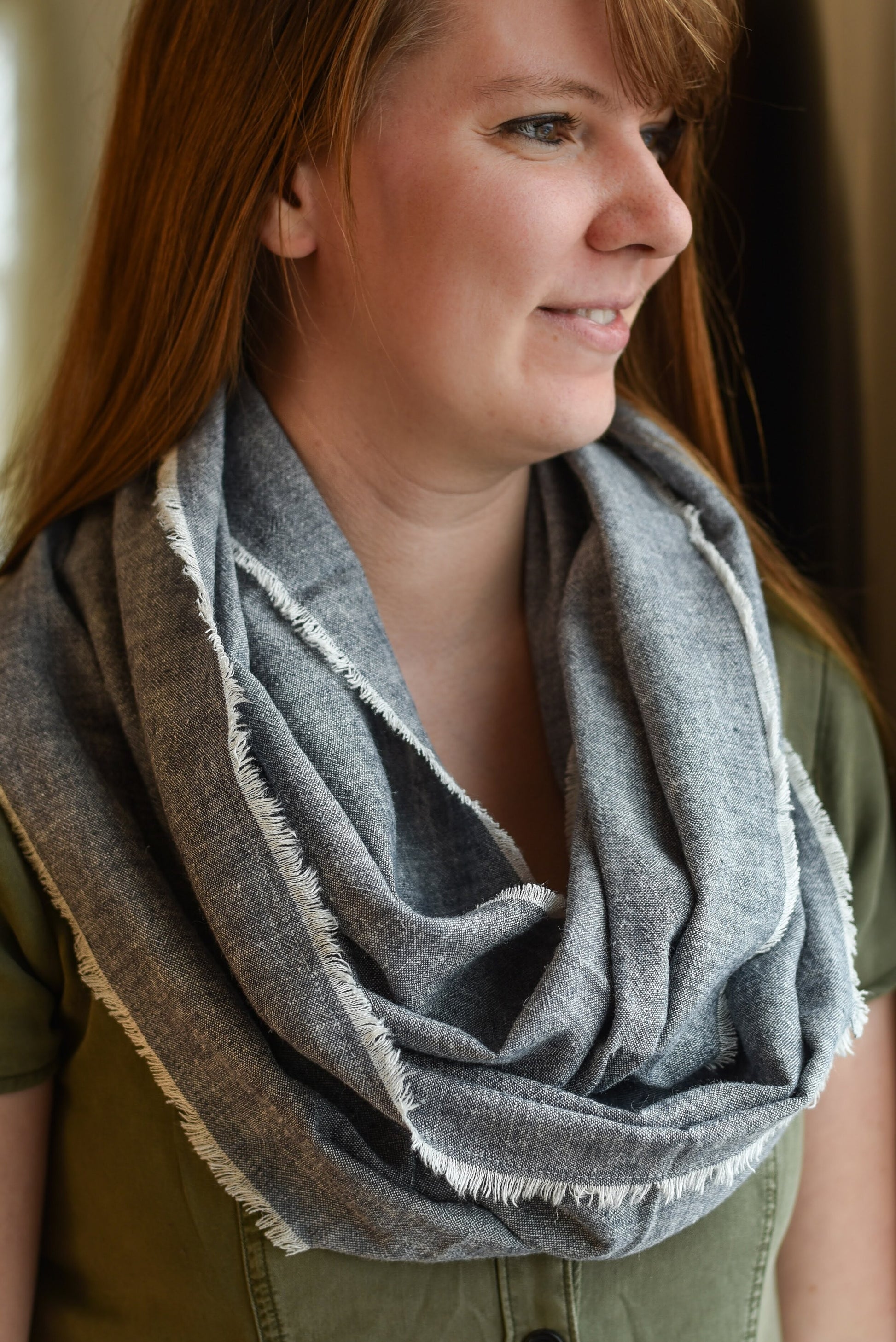 Light weight infinity scarf handmade from soft linen blend material. The edges are hand frayed for added casual comfort. Wear in a single or double wrap (double wrap shown in photos).