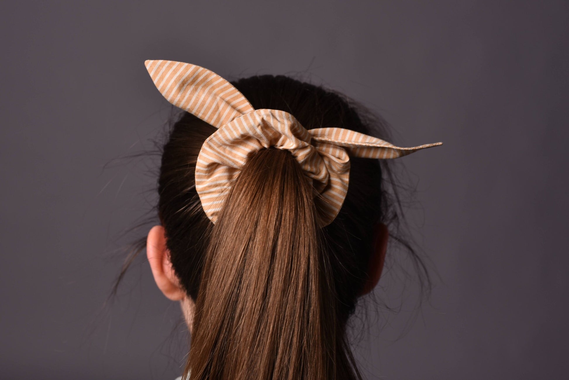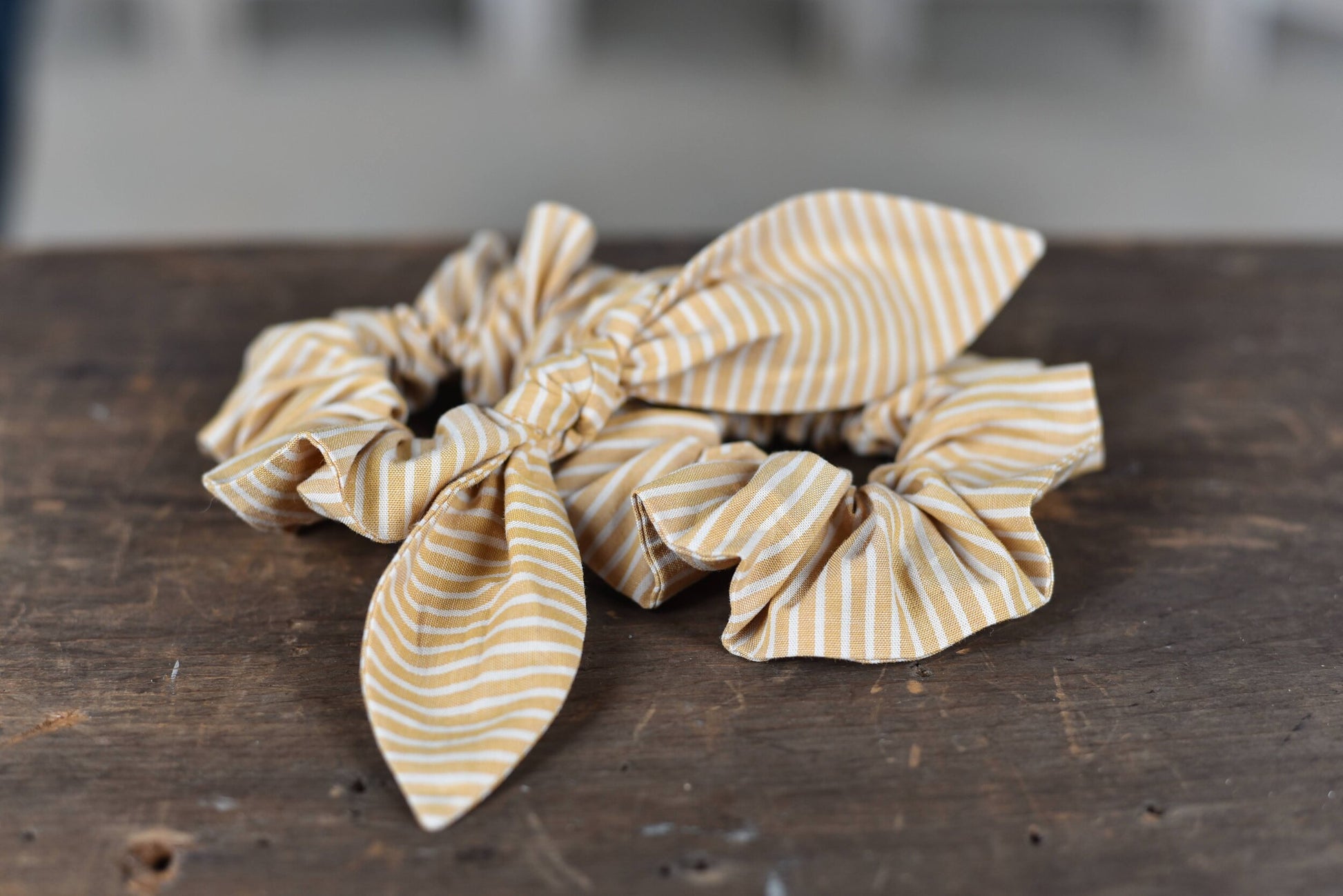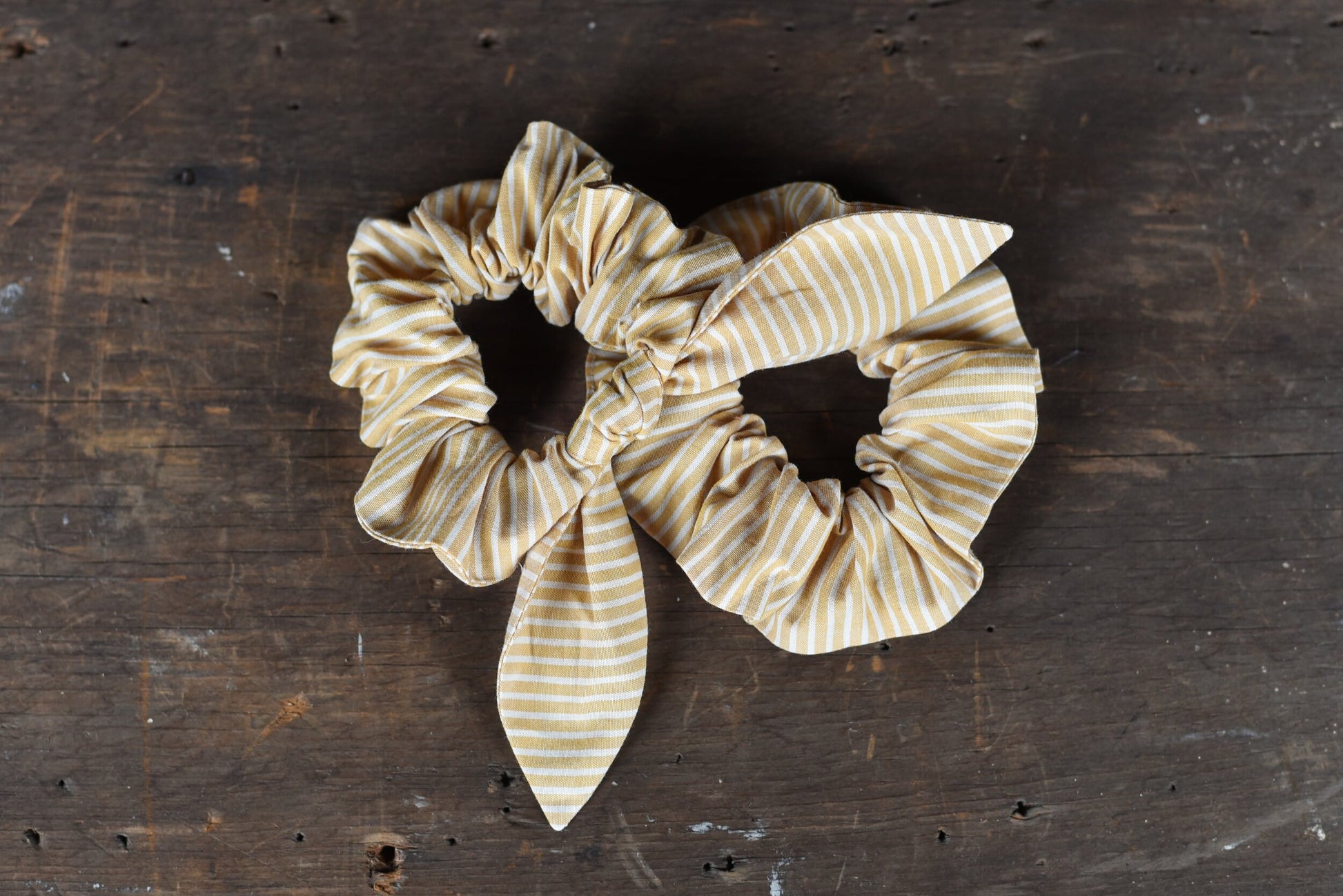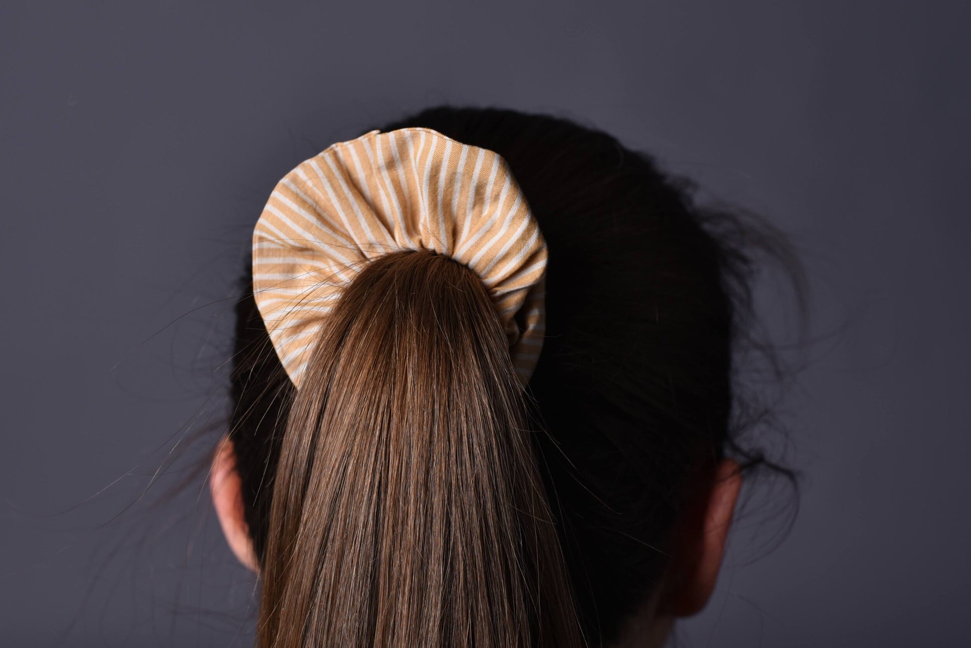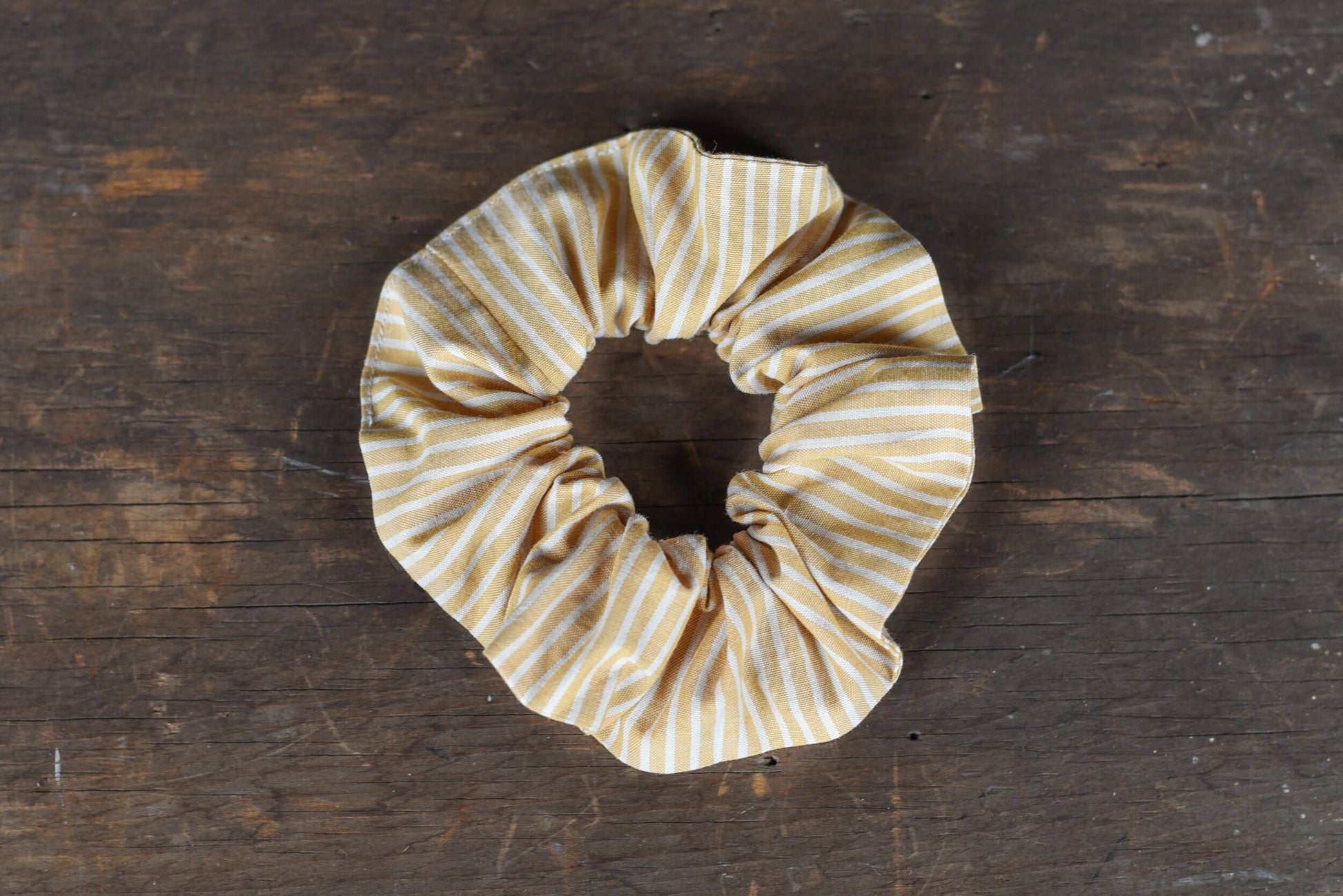 Beautiful full fabric scrunchie fits perfectly around wrist and wraps 2-3 times around hair depending on thickness. Every scrunchie is hand cut & sewn with flat elastic secured inside and stitched for a long lasting accessory you can use time and time again.