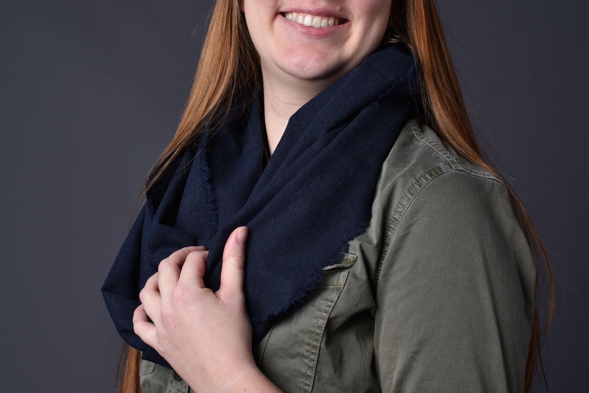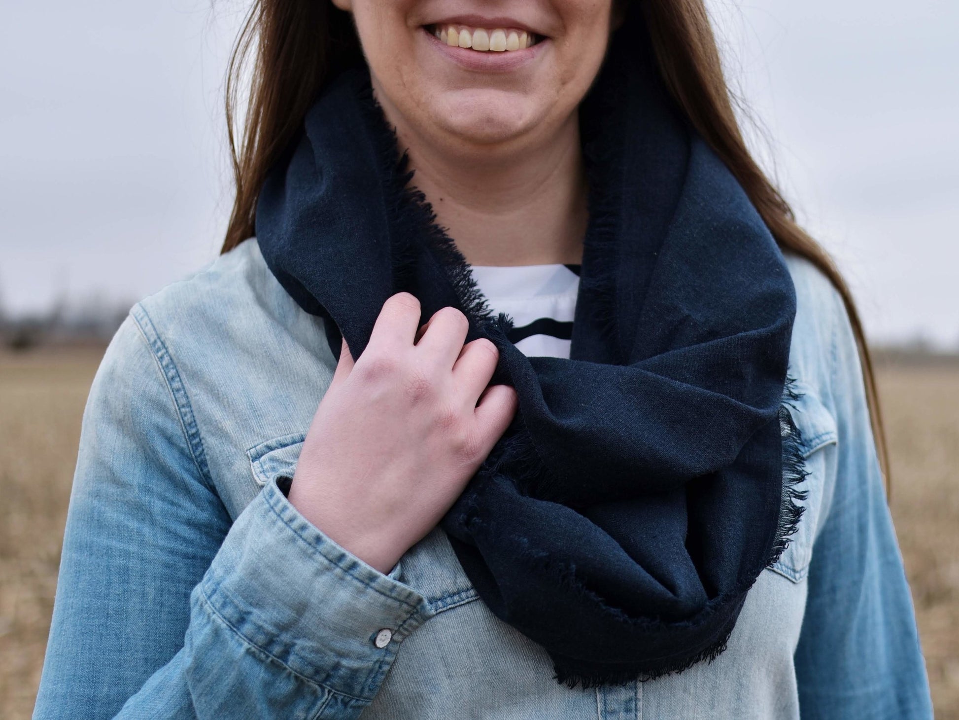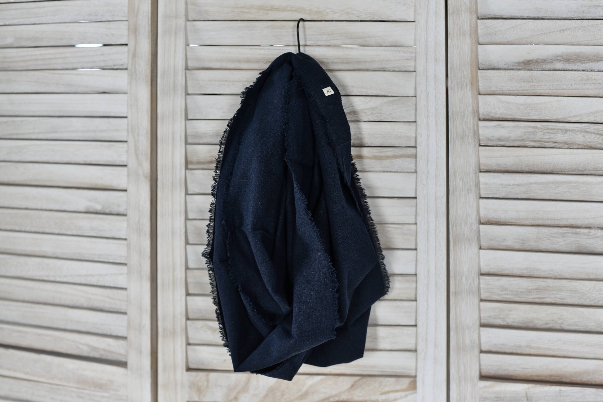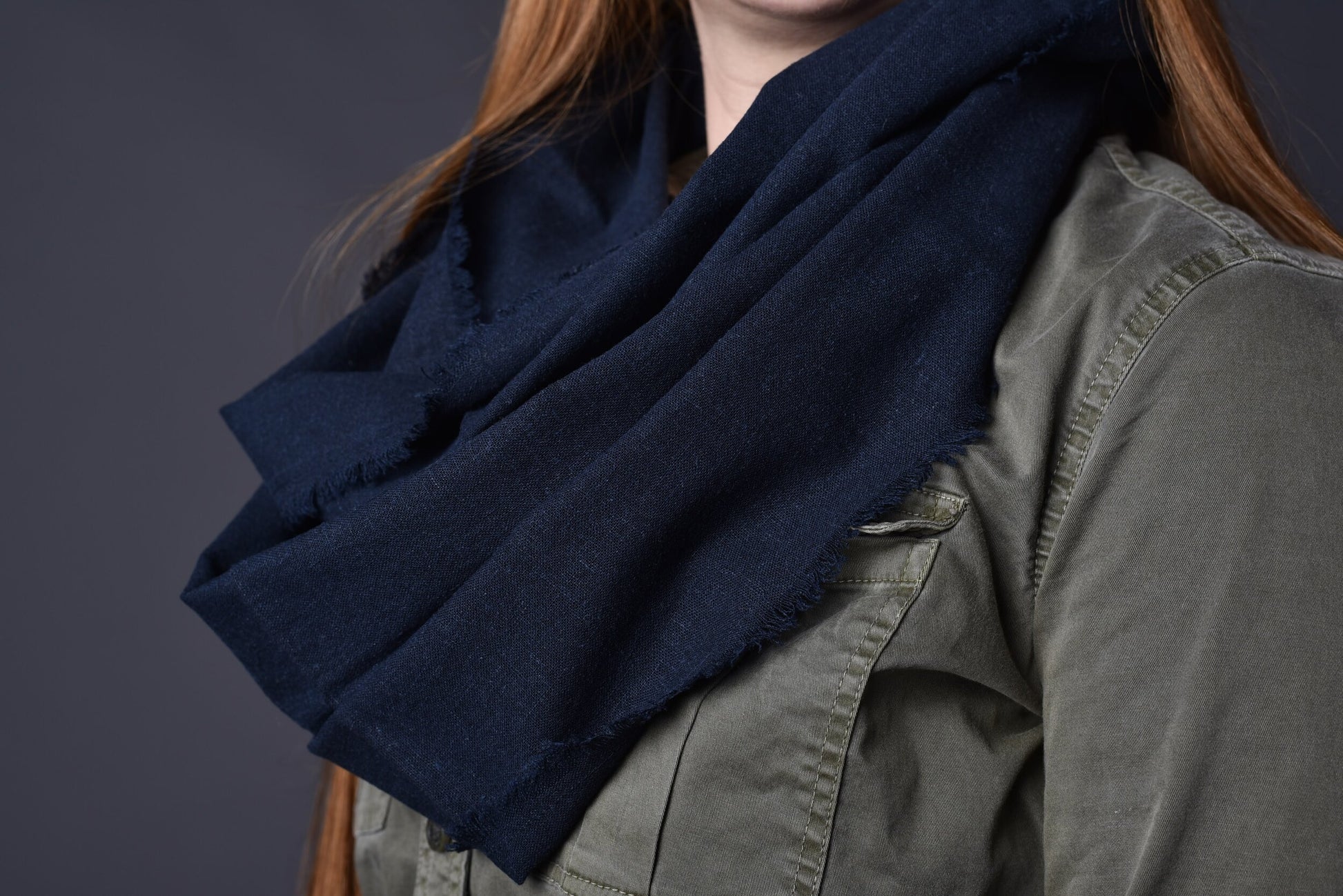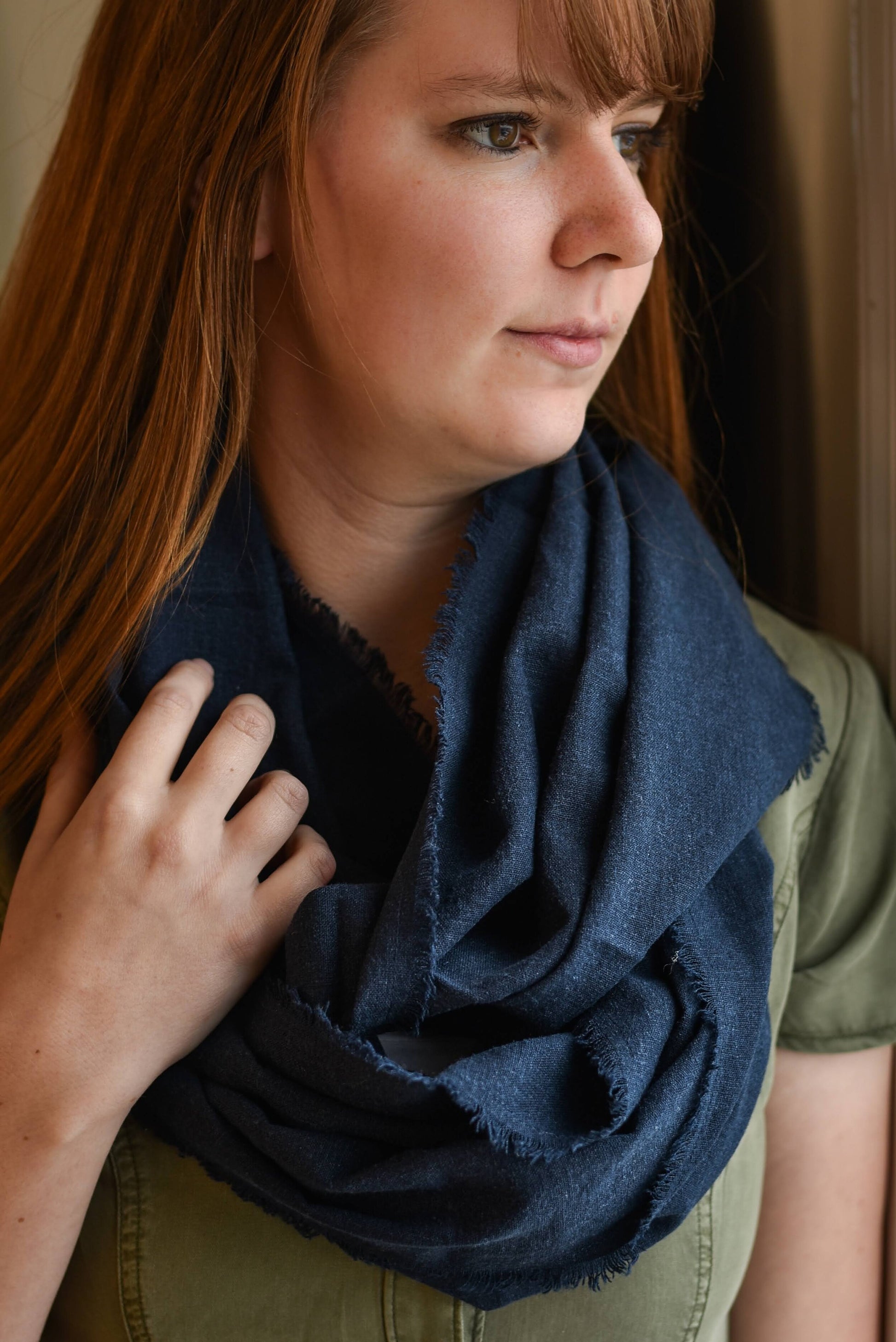 Light weight infinity scarf handmade from soft linen blend material. The edges are hand frayed for added casual comfort. Wear in a single or double wrap (double wrap shown in photos).