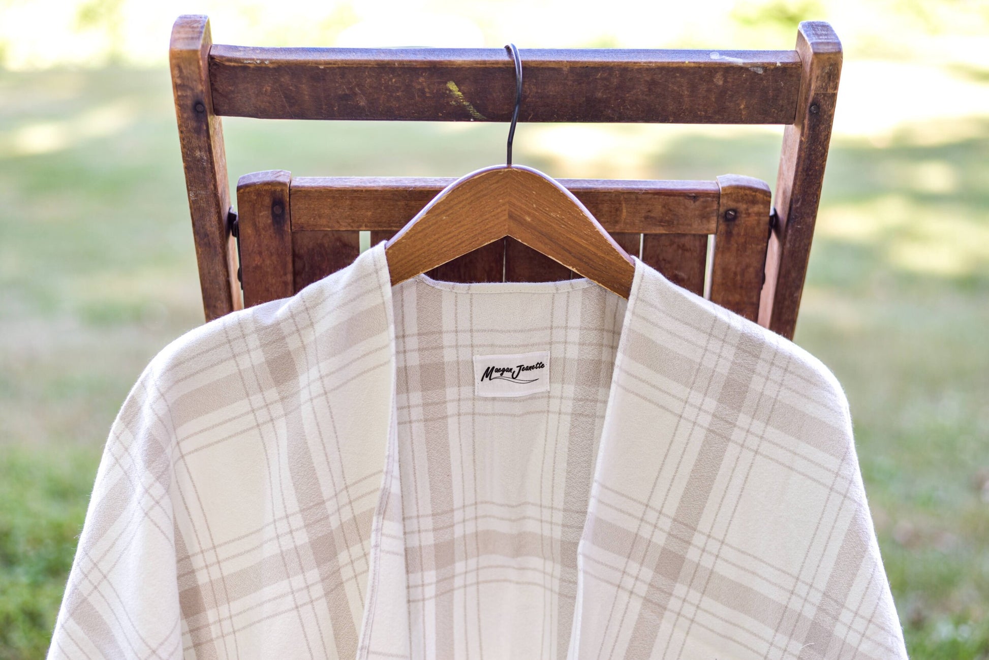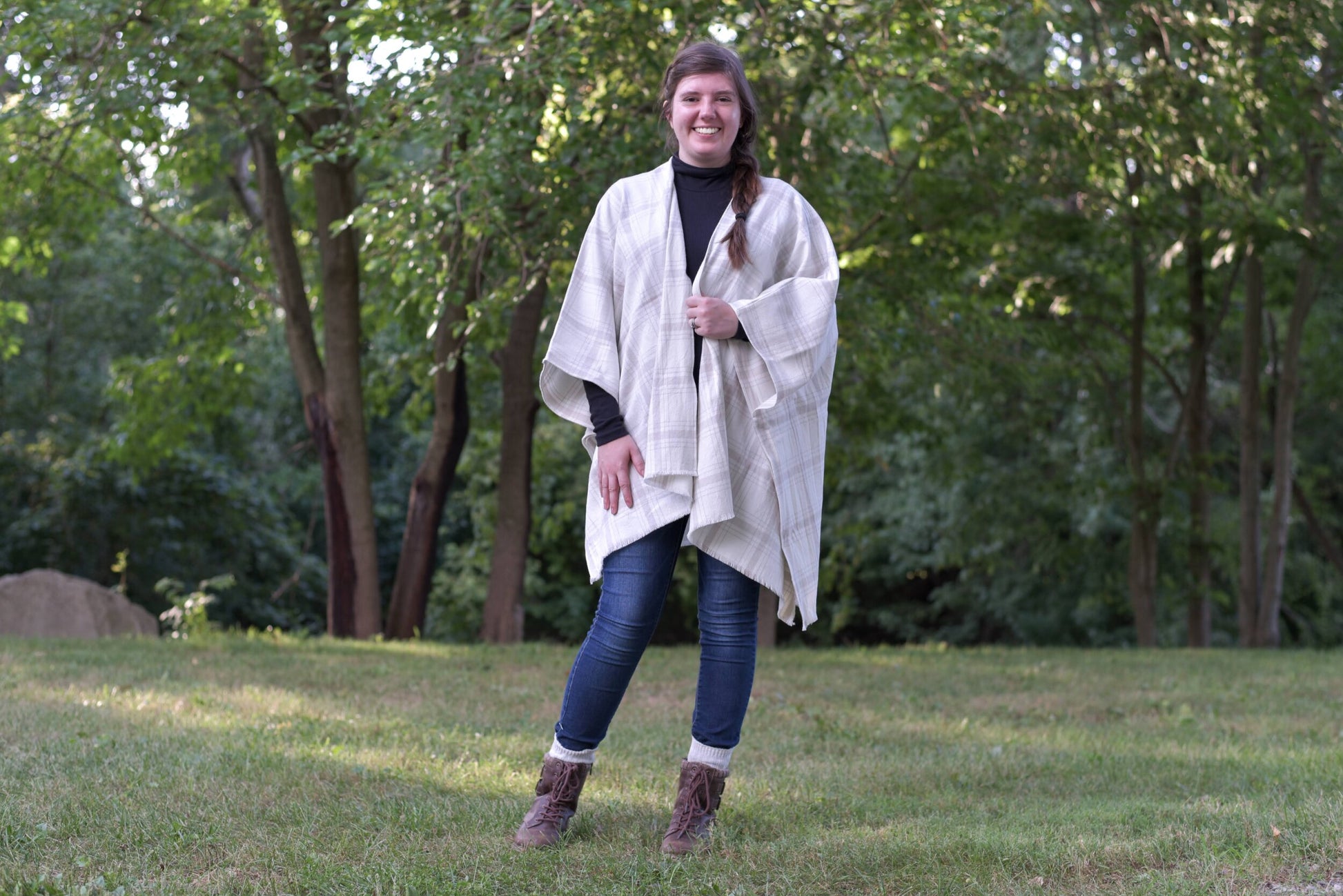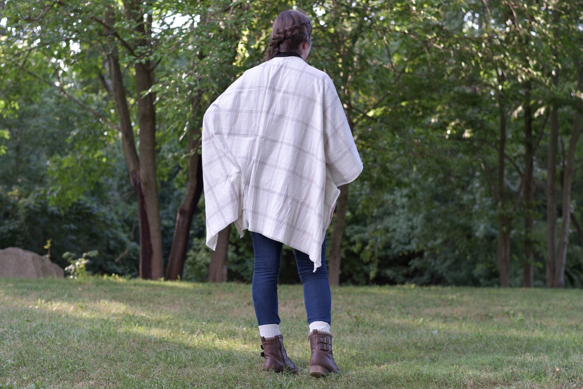 Handmade poncho with frayed bottom edge and a row of stitching to prevent further fraying. Clean finished front edge & sides to prevent fraying. This oversized cozy poncho cape is great as an additional layer during the colder weather. Perfect for festive holiday parties, family photos, or a walk in the park!