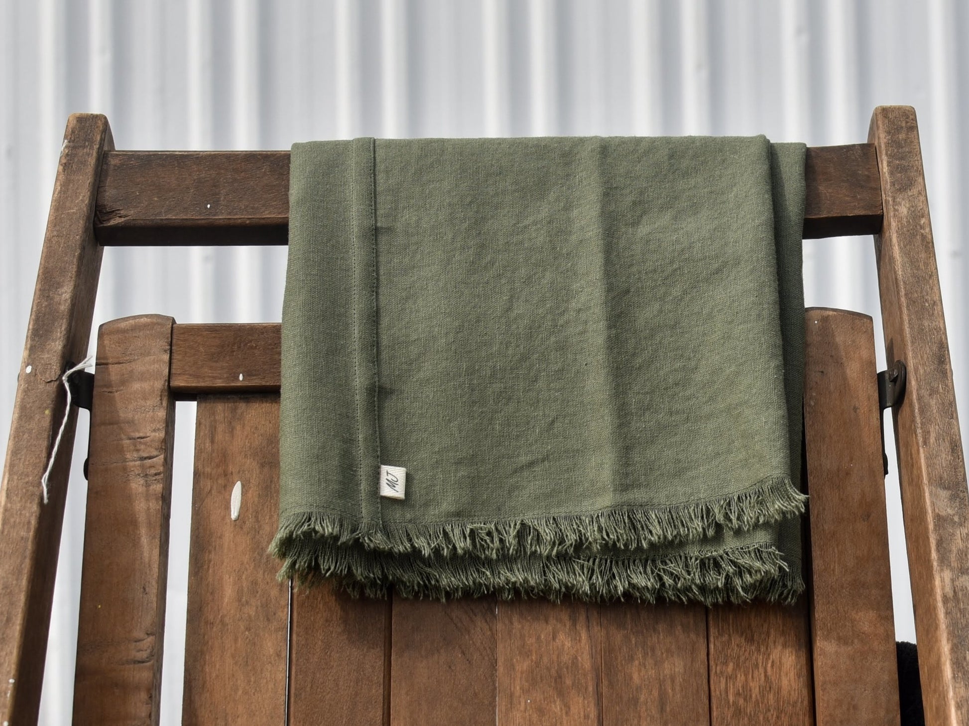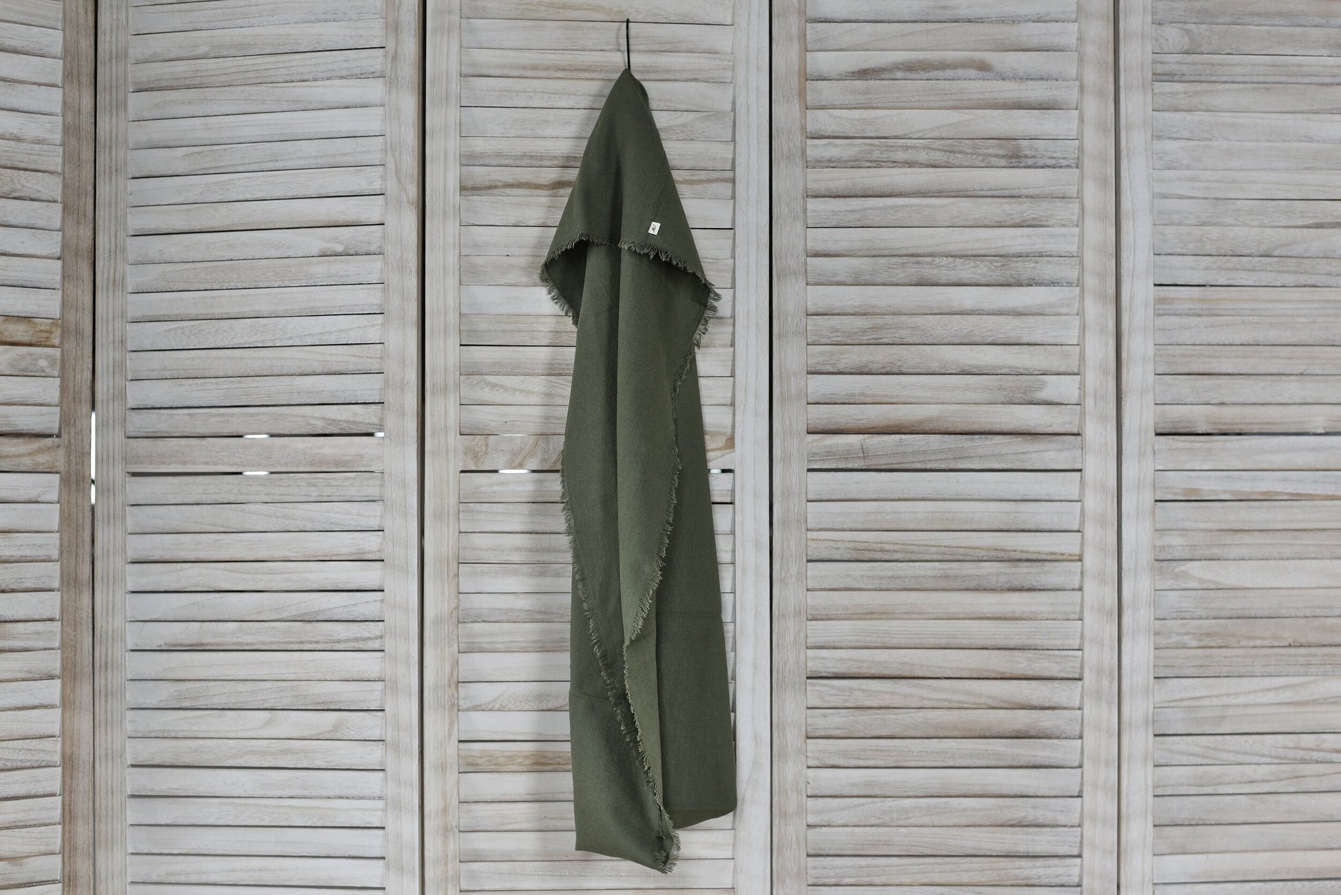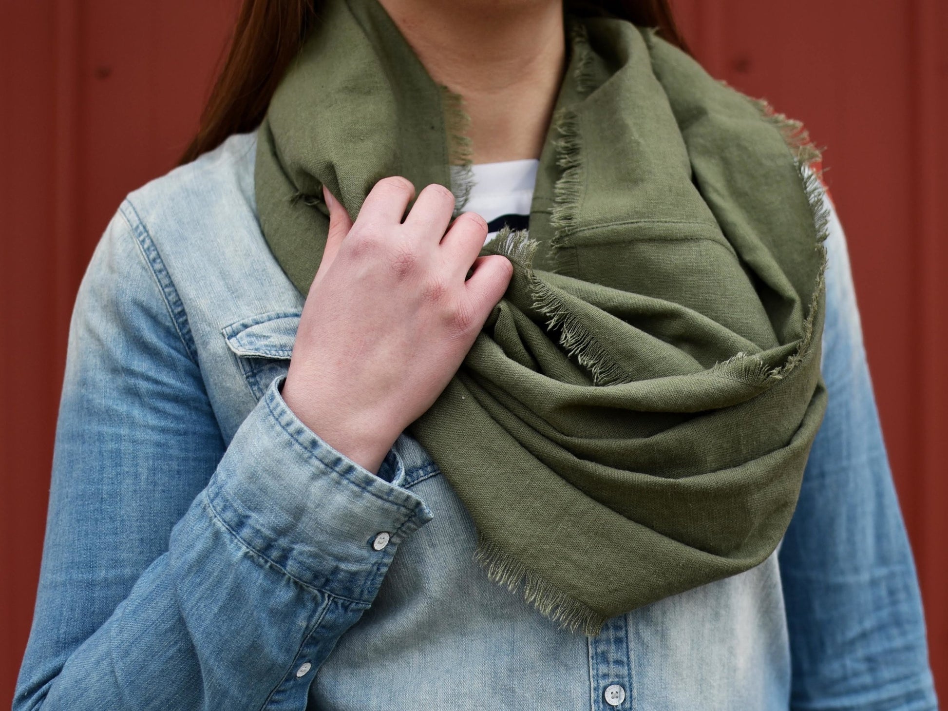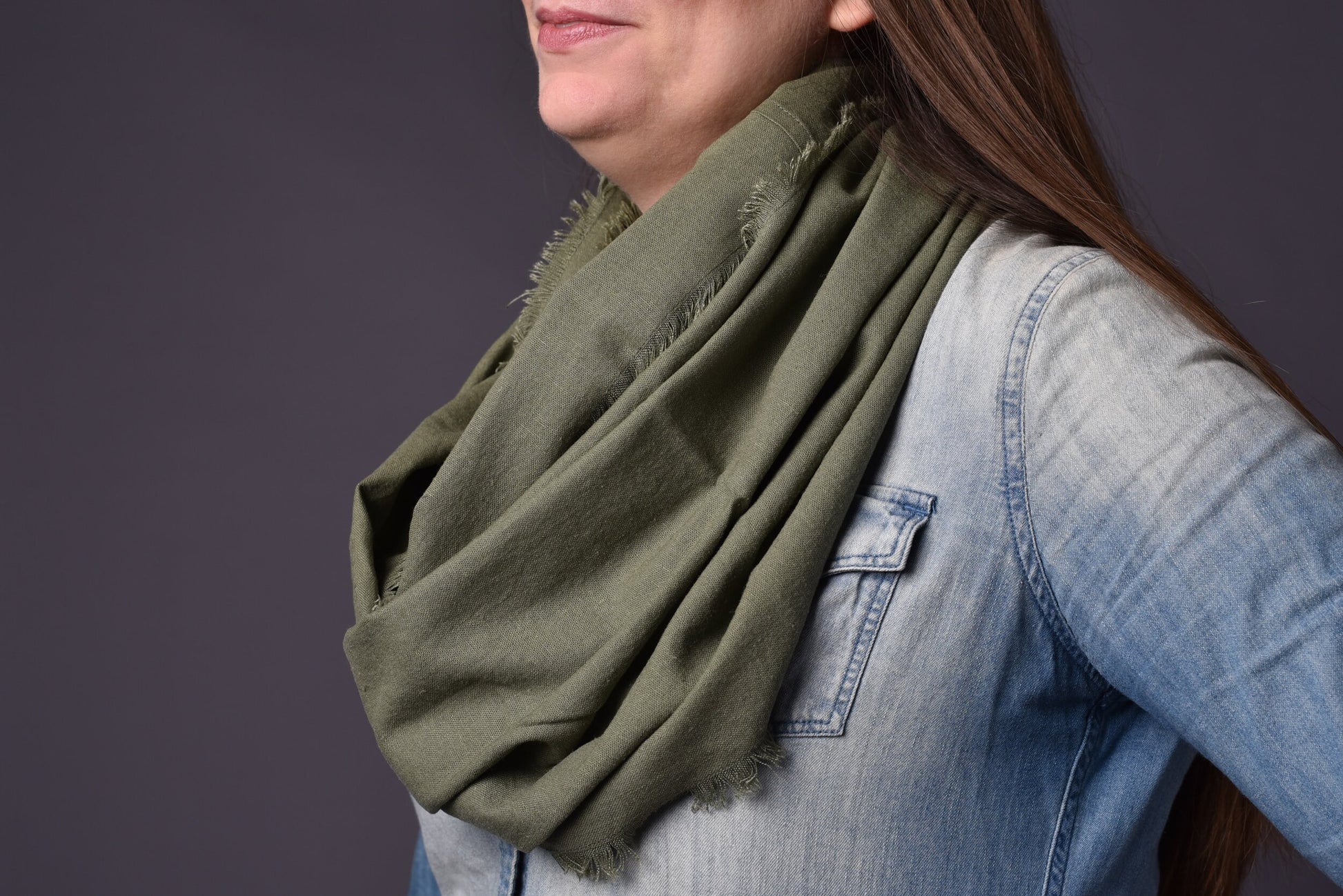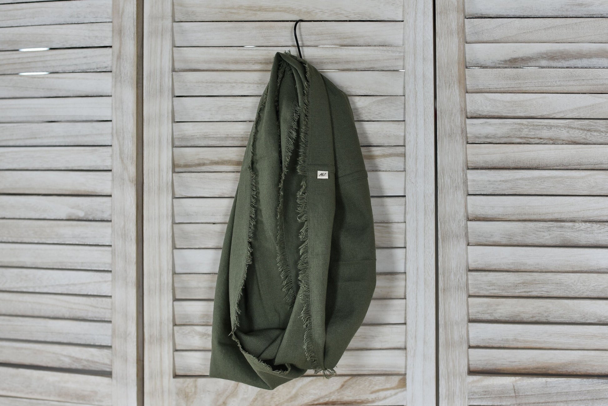 Light weight infinity scarf handmade from soft linen blend material. The edges are hand frayed for added casual comfort. Wear in a single or double wrap (double wrap shown in photos).
