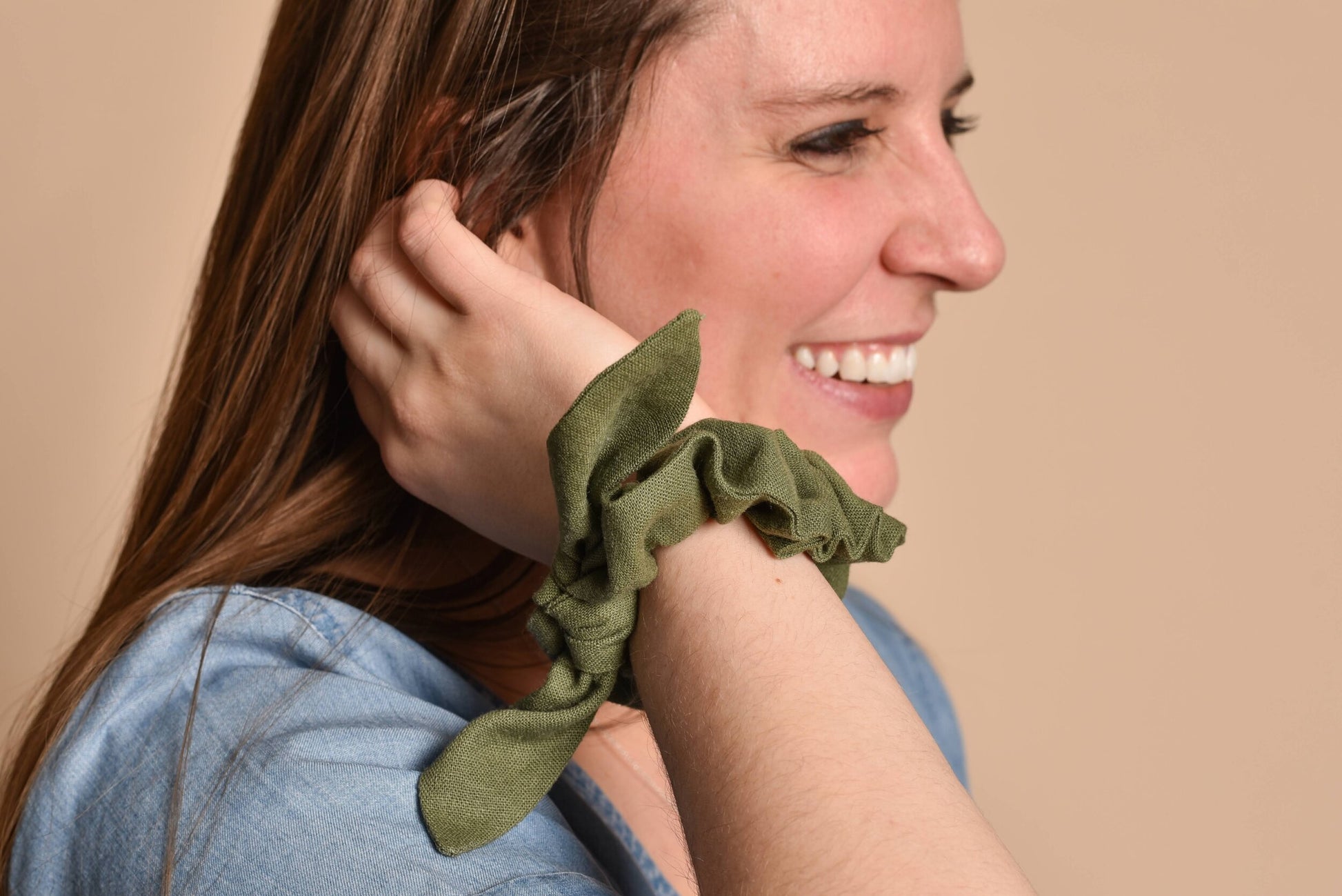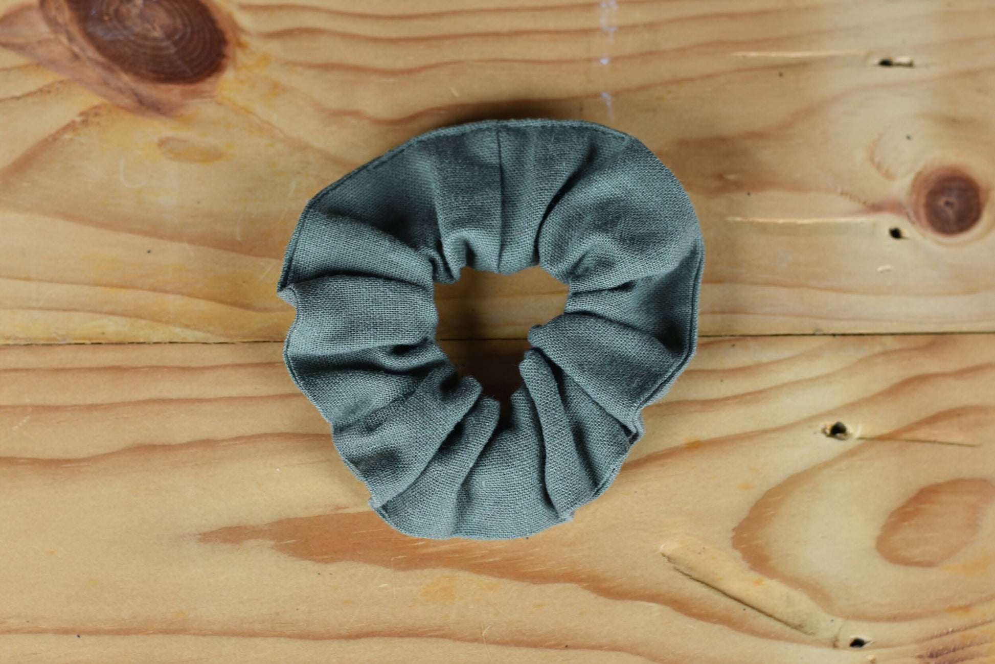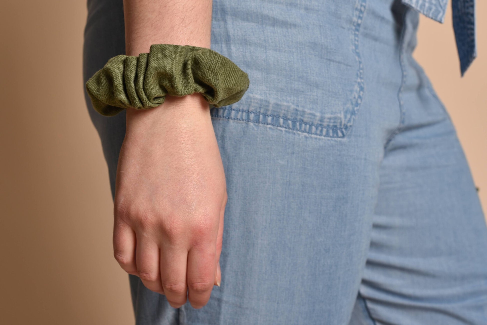 Beautiful full fabric scrunchie fits perfectly around wrist and wraps 2-3 times around hair depending on thickness. Every scrunchie is hand cut & sewn with flat elastic secured inside and stitched for a long lasting accessory you can use time and time again.