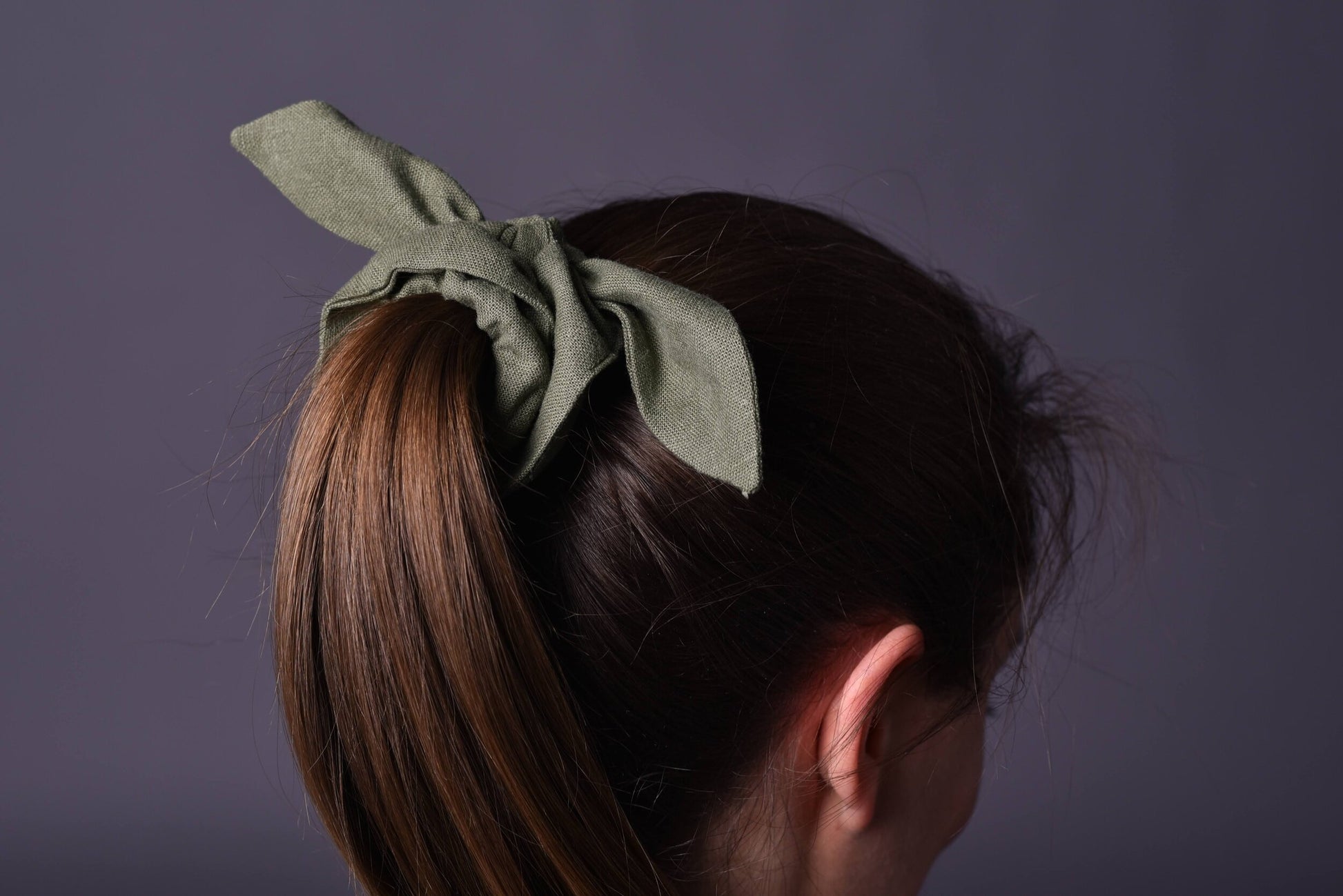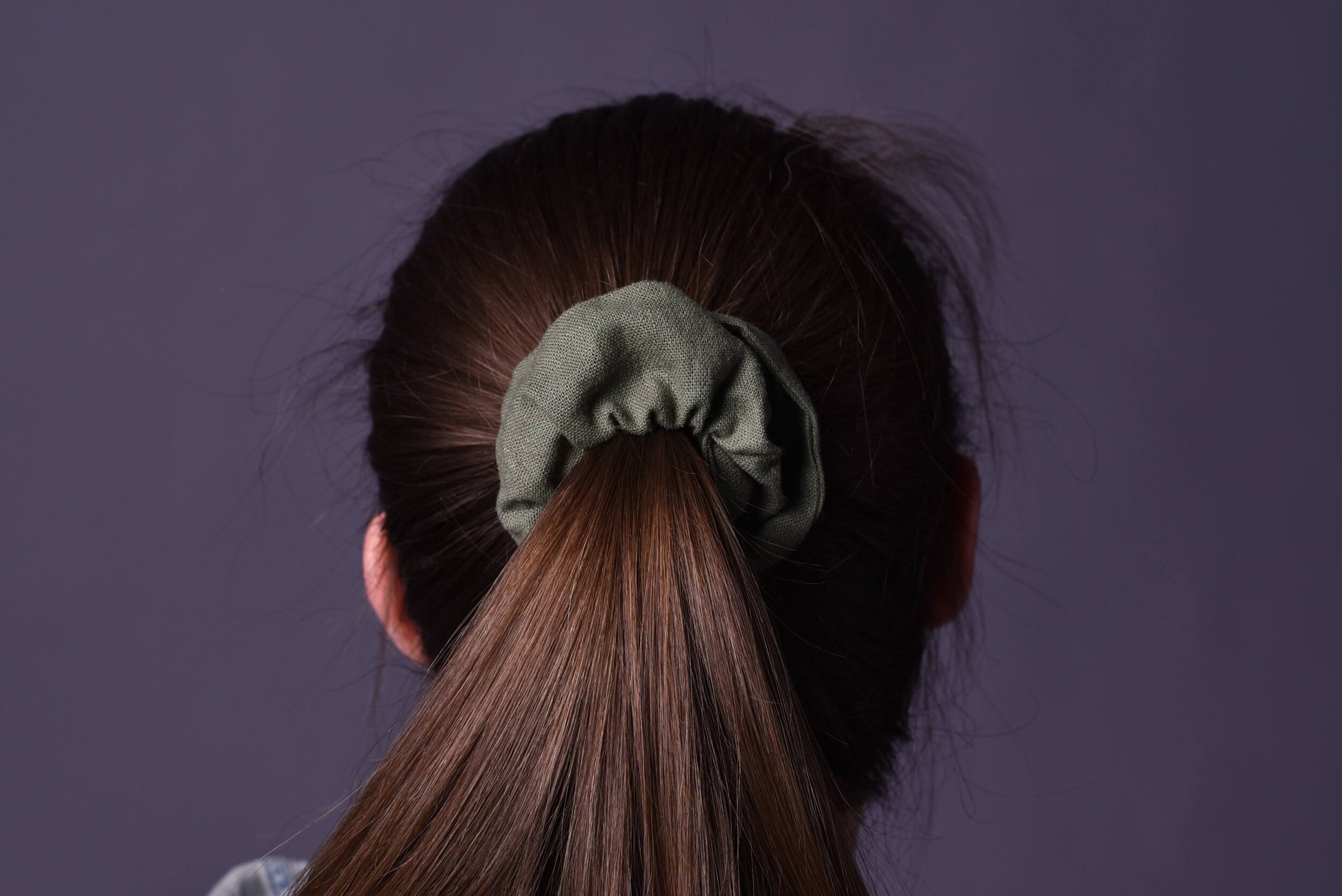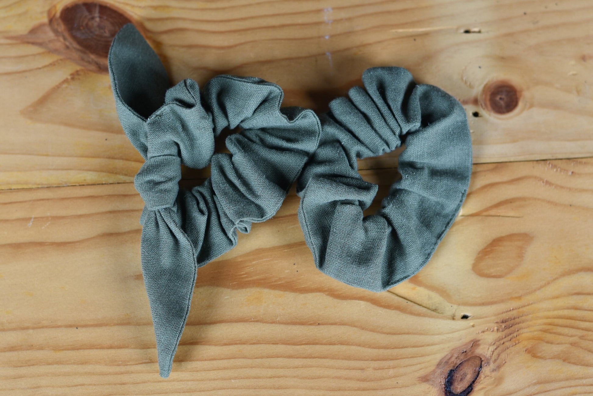 Beautiful full fabric scrunchie fits perfectly around wrist and wraps 2-3 times around hair depending on thickness. Every scrunchie is hand cut & sewn with flat elastic secured inside and stitched for a long lasting accessory you can use time and time again.